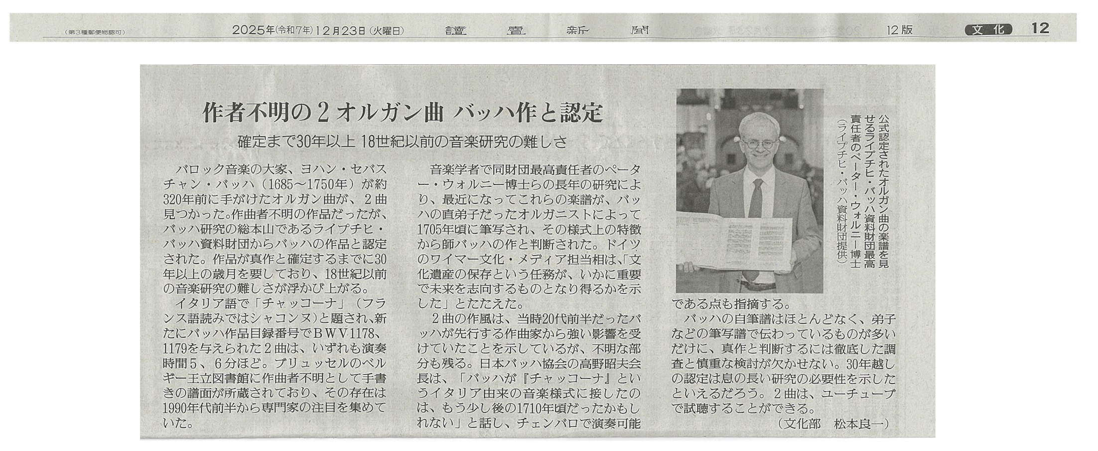 先日11月17日に発表された、2曲のバッハ作品に対し、会長の髙野昭夫のコメントが新聞記事として掲載されました。